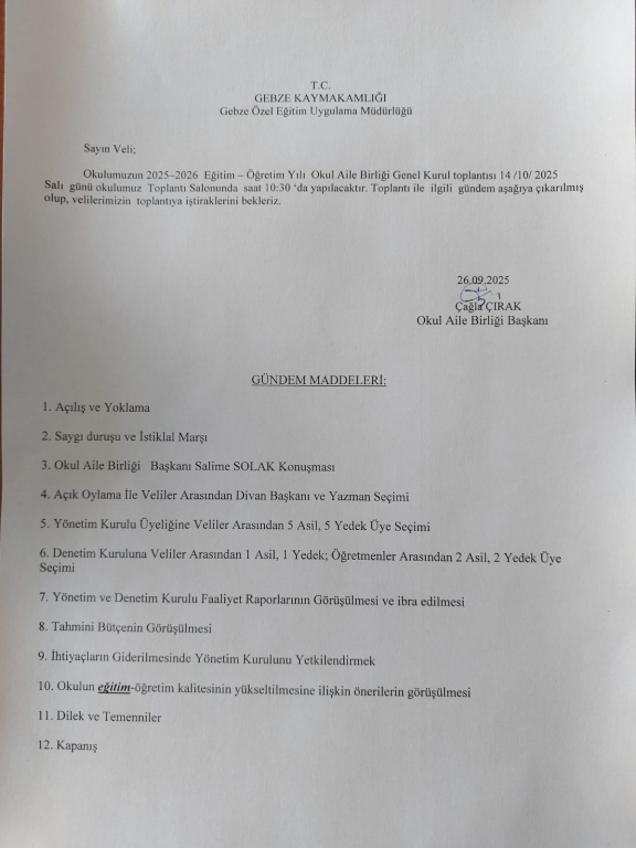 2025-2026 EĞİTİM ÖĞRETİM YILI OKUL AİLE BİRLİĞİ GENEL KURUL TOPLANTISI DUYURU VE GÜNDEMİ